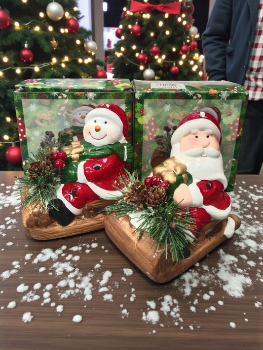 Ceramic Santa on Sled Christmas Figurine – Festive Table Décor with Pinecones & Berries | Holiday Home Decoration (1 Piece)