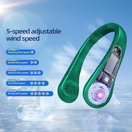 Portable Neck Fan, Personal Fan USB Rechargeable Neck Fan, 5 Speed Hanging Bladeless Fan with Monitor (Green)