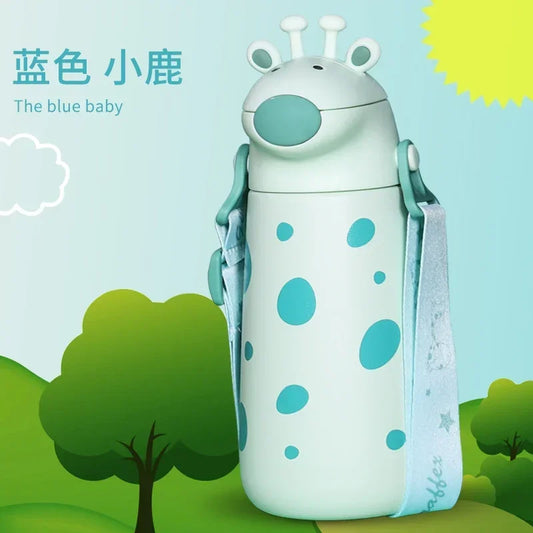 Kids Green Giraffe Thermos Flask Water Bottle with One-Touch Flip Lid and Straw, Stainless Steel Bottle 400 ML