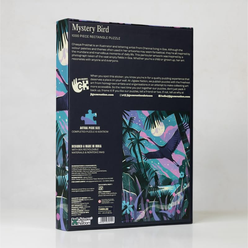 Unwind, focus, and challenge your mind with the 1000-Piece Mystery Bird Jigsaw Puzzle, beautifully illustrated by Chaaya Prabhat. Featuring a captivating bird-themed artwork filled with intricate details and rich colors, this puzzle offers a rewarding and immersive experience for both adults and older kids.
