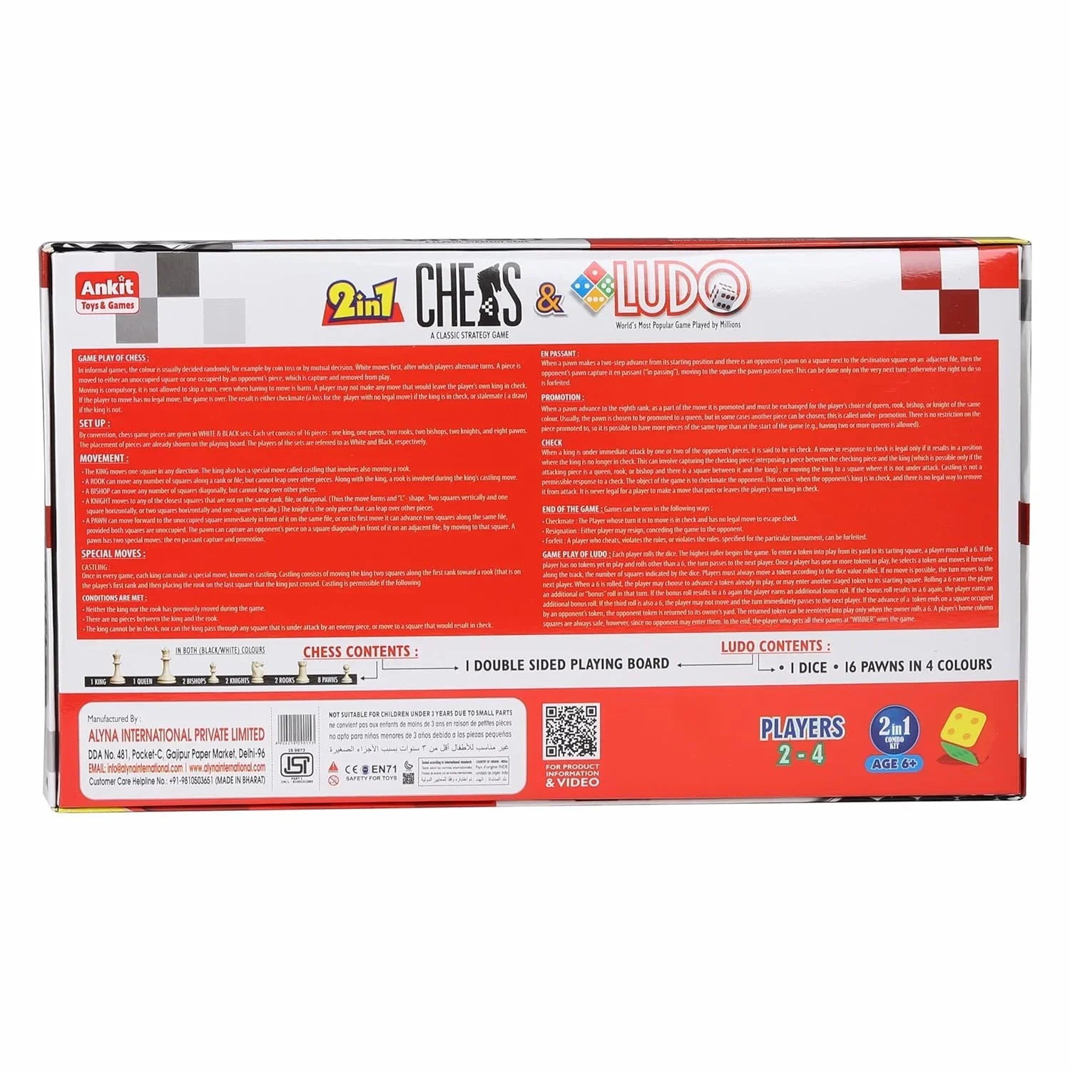 Enjoy two timeless classics in one with the Ankit Toys & Games 2-in-1 Chess & Ludo Board Game Set. Designed for both kids and adults, this dual-sided board gives you the thrill of strategic Chess gameplay on one side and the joyful family fun of Ludo on the other. The 38×38 cm board is lightweight, foldable (if applicable), and perfect for home, travel, picnics, or game nights.