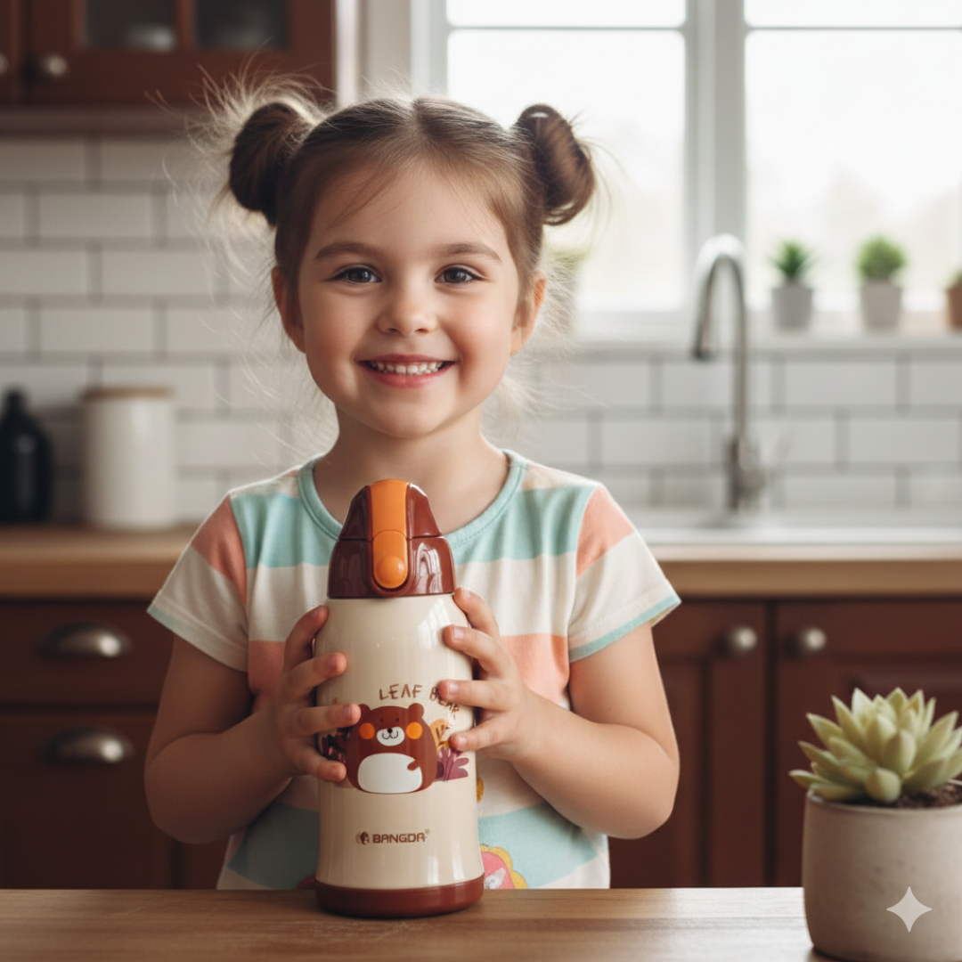 The double-wall vacuum insulation helps keep drinks hot or cold for longer durations, making it perfect for school, travel, picnics, or home use. Made with food-grade, BPA-free materials, this bottle ensures safety along with durability. Cute, practical, and kid-approved—hydration has never been this fun!