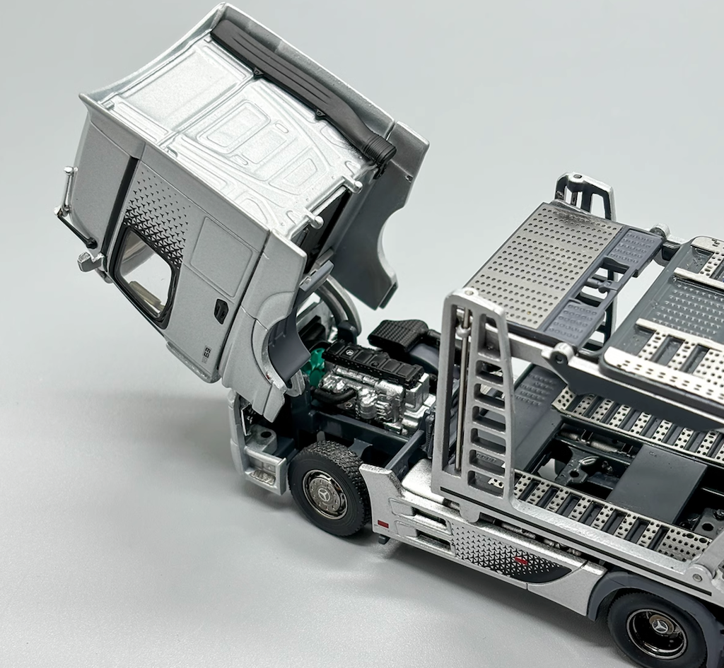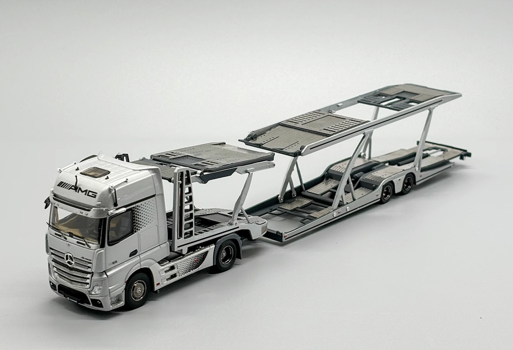 Experience heavy-duty precision in miniature form with the GCD 1:64 Silver AMG Actros Gigaspace 4x2 Trailer Truck Diecast Model. Designed for serious collectors, this premium diecast model faithfully recreates the iconic Mercedes-AMG Actros Gigaspace tractor paired with a realistic car-carrier style trailer.