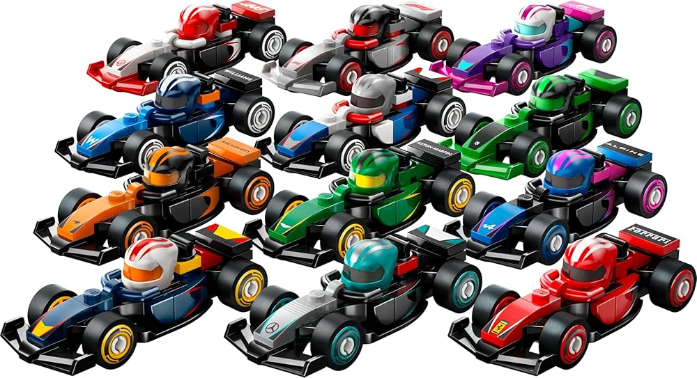 Rev up your collection with the complete Pack of 12 F1 Collectible Race Cars (set 71049). Each of the 12 mystery vehicle kits includes a micro F1 race car in official team liveries, a cockpit with a helmet, functioning wheels, and unique printed pieces. Designed for ages 6+, these quick-to-build minis (29 pieces each) make an excellent gift, collectors item, or addition to LEGO city layouts and Speed Champions displays. Released May 2025 as part of the LEGO Collectible Minifigures line .