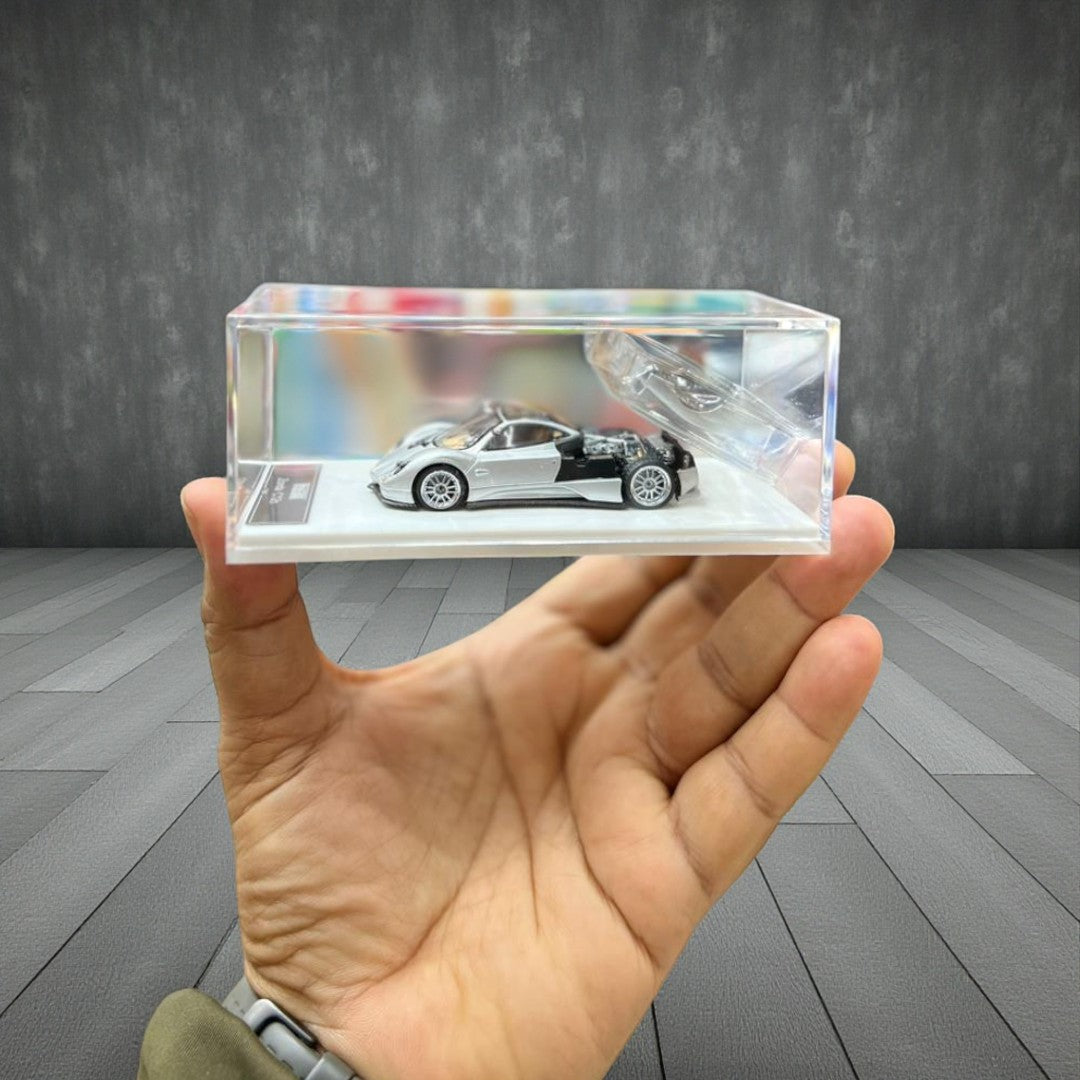 The LMF Pagani Zonda C12s in 1:64 scale captures the iconic design and engineering brilliance of Pagani’s legendary supercar. Finished in a refined light blue / sky blue metallic shade, this model showcases signature quad-headlights, sculpted aerodynamic bodywork, detailed wheels, and visible mechanical components. Supplied with a premium display base and branded packaging, it is a standout addition to any high-end diecast supercar collection.