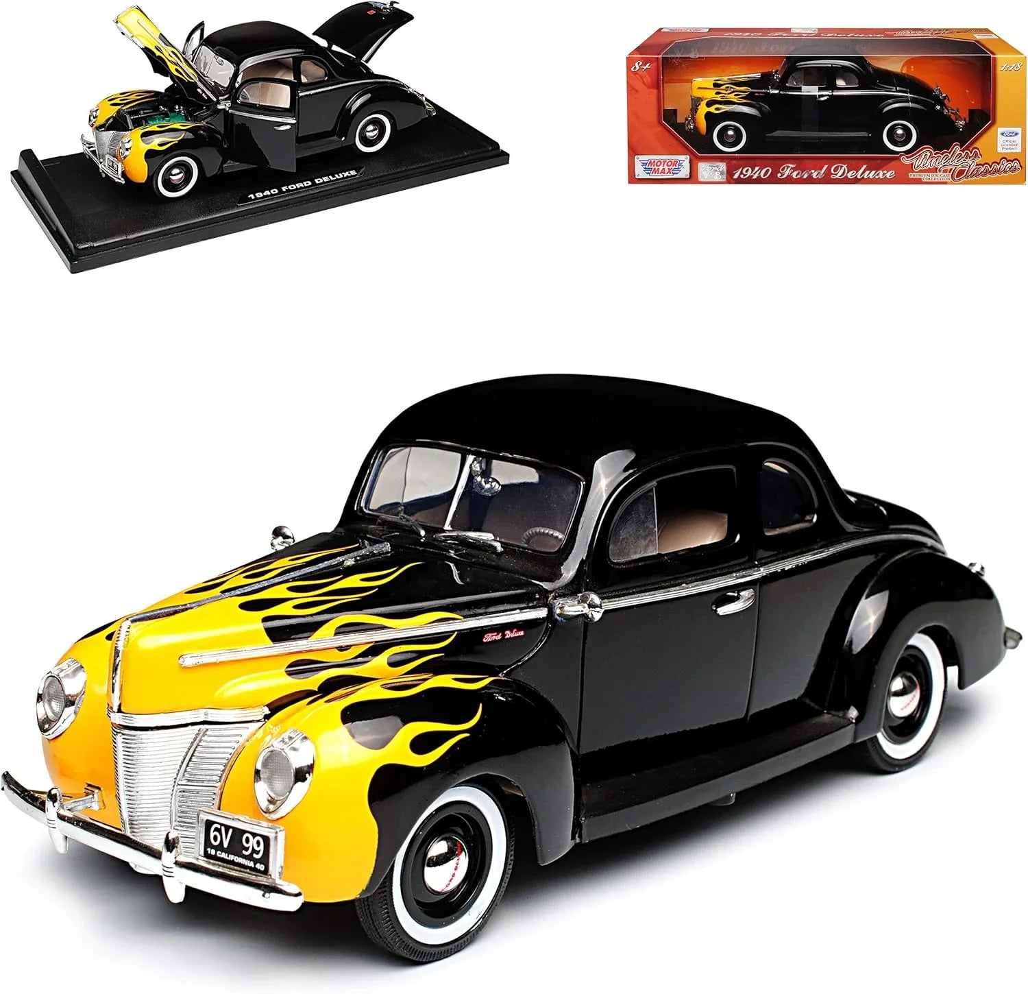Add a touch of vintage style to your diecast collection with the Motor Max 1:18 Scale 1940 Ford Deluxe Hardtop. This stunning collectible model car captures the essence of the classic American hot rod with its glossy black body and bold yellow flame detailing. Crafted with precision, it features detailed interiors, realistic chrome accents, functional opening parts, and smooth-rolling wheels. Whether displayed on a shelf or gifted to a car enthusiast, this diecast Ford Deluxe is a true showstopper that combines nostalgia, craftsmanship, and style.
