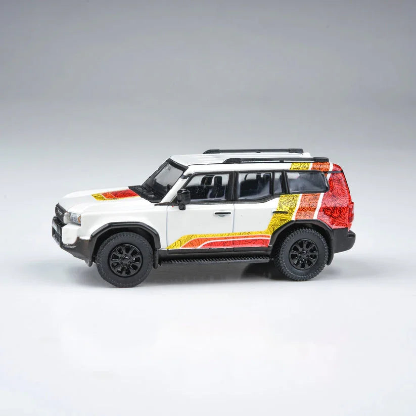 Bring legendary off-road power into your collection with this 1:64 Scale Toyota Land Cruiser 250 TRD Colours Diecast Model Car, featuring a rugged SUV stance, detailed exterior styling, and eye-catching graphic livery on a crisp white body.