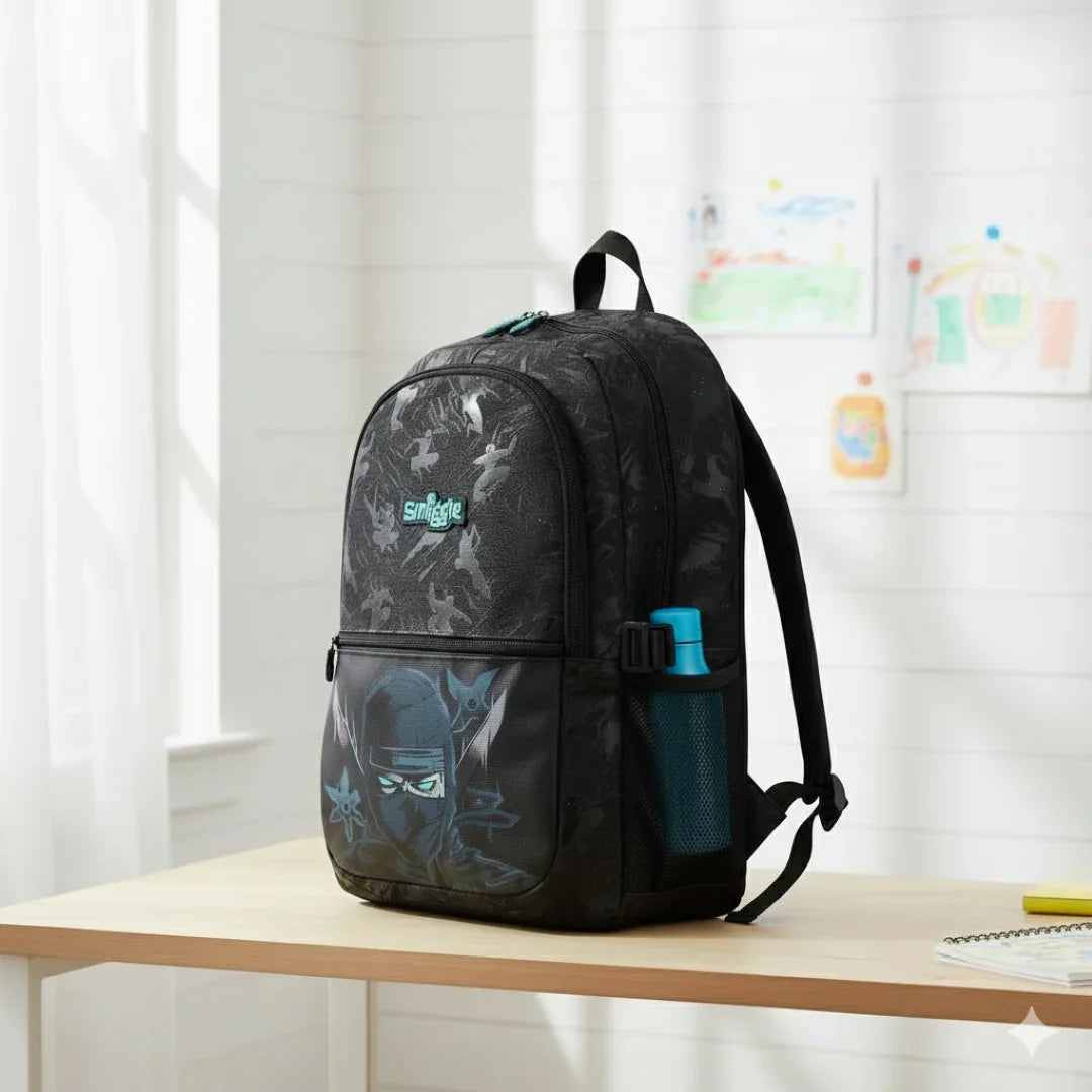 Level up school gear with the Smiggle Classic Attach Backpack – 16 Inch Ninja Theme, designed for kids who love bold, action-packed style. This premium Smiggle backpack features an eye-catching stealth ninja graphic, embossed detailing, and signature Smiggle branding that stands out effortlessly. Perfectly sized for school essentials, it includes a spacious main compartment for books and folders, a large front pocket for accessories, and dual drink bottle sleeves for convenience.