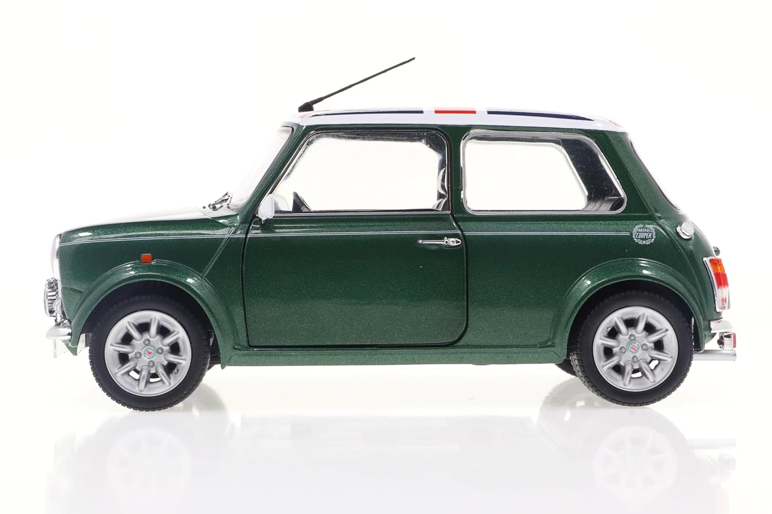 The 1:18 Scale Mini Cooper Sport by SOLIDO is a beautifully crafted diecast model that captures the timeless charm and sporty character of the iconic Mini. Finished in a classic British racing green with contrasting white racing stripes and a Union Jack roof design, this model stands out as a premium collector’s piece.