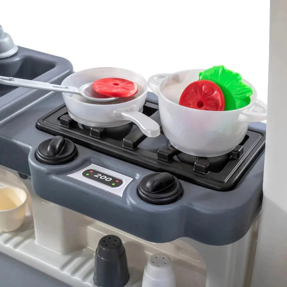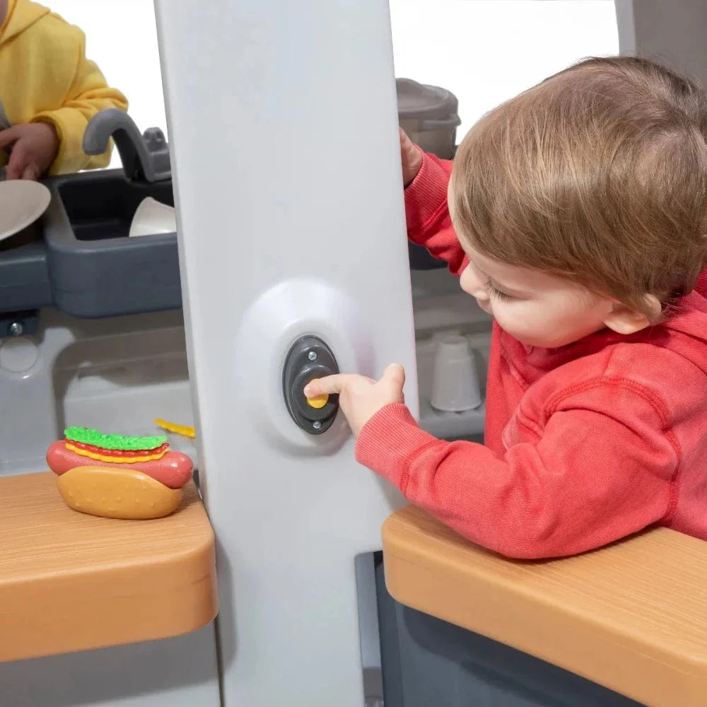 Explore the great outdoors with this play camper. The Adventure Camper is loaded with engaging pretend play activities, perfect for social development. Featuring a molded-in kitchen area with large sink, stovetop with clicker knobs, and plenty of storage space. Other realistic features include a skylight, doorbell and decorative wheel.Β Made in the USAΒ of US and imported parts.