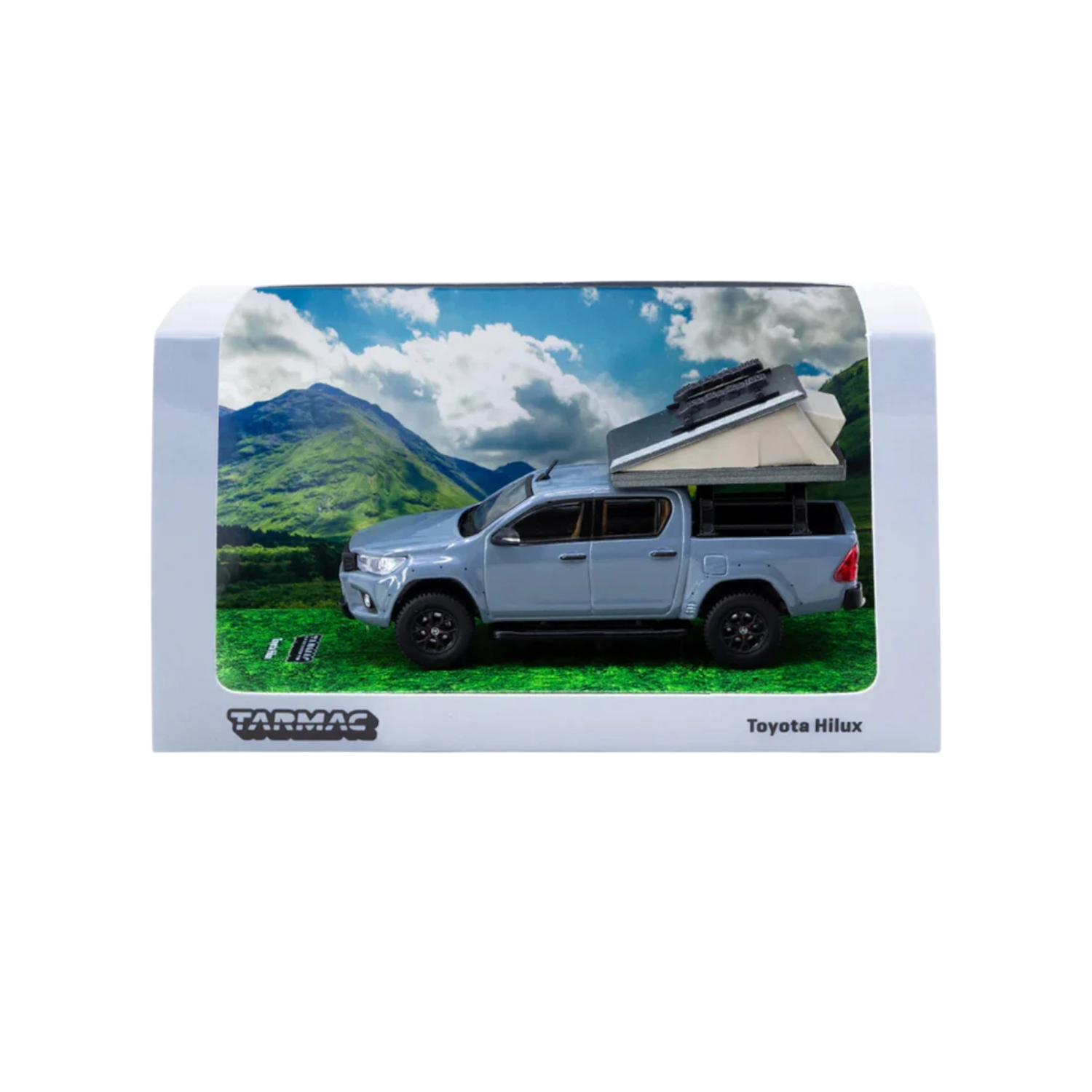 Highly detailed 1:64 scale Toyota Hilux diecast pickup by Tarmac Works, featuring realistic off-road detailing, premium finish, free-rolling wheels, and collector display packaging. Ideal for collectors and diorama setups.